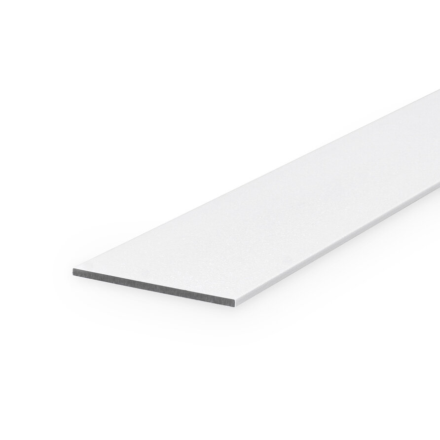 Een witte, massieve aluminium strip (plat) van 60x2 mm, wit gepoedercoat in RAL 9016, 9010 of 9001. Deze alu platstaf (lat) kunt u bij ons op maat bestellen in lengtes van 100 tot 2950 mm, optioneel in verstek gezaagd. Lees meer